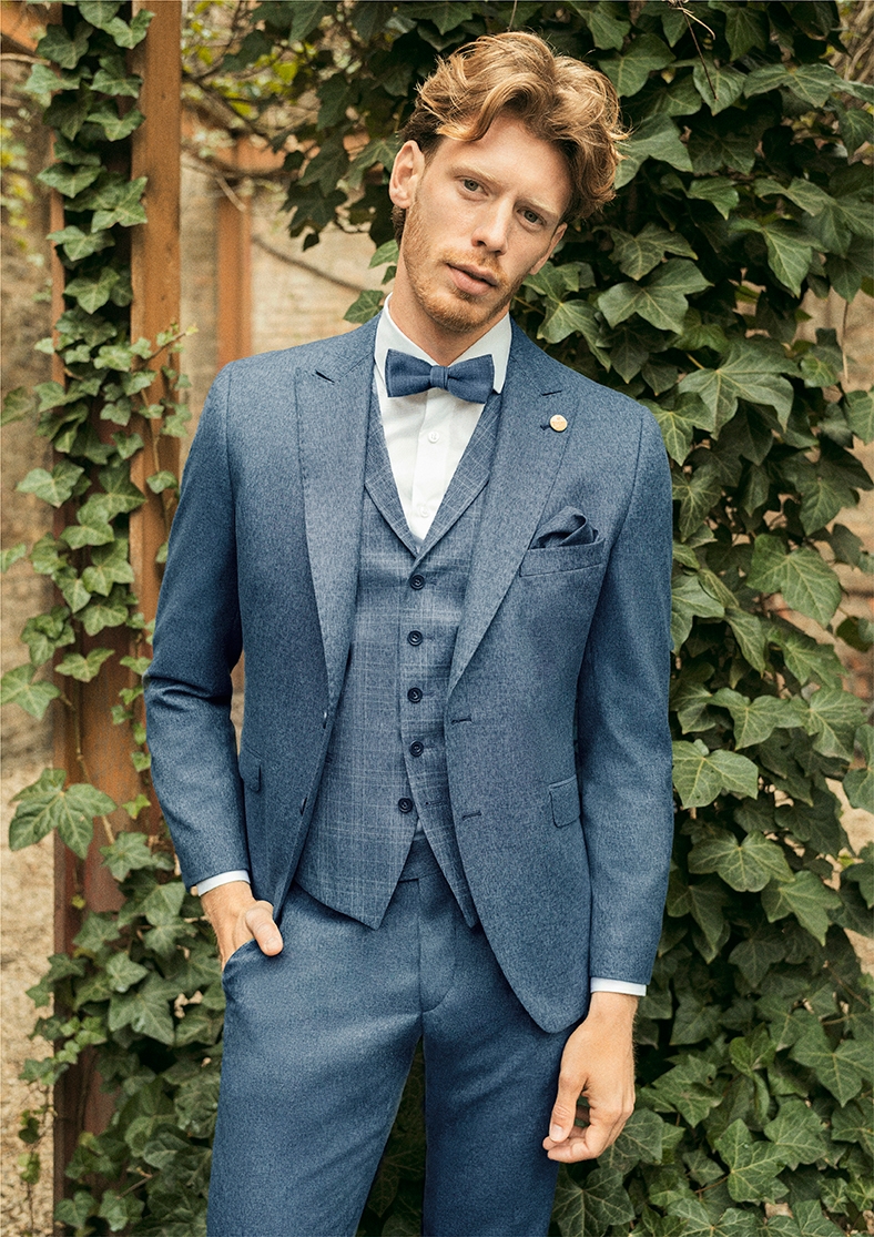 fedett zseb, dísztűzött hegyes gallér, kétgombos karcsúsított zakó, hozzá illő mellény szett